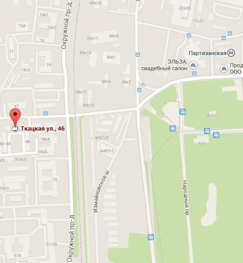 м.Партизанская, последний вагон из центра. Из метро направо, затем направо по тротуару под мост. После моста 3-й дом по левую руку - ул.Ткацкая, 46.